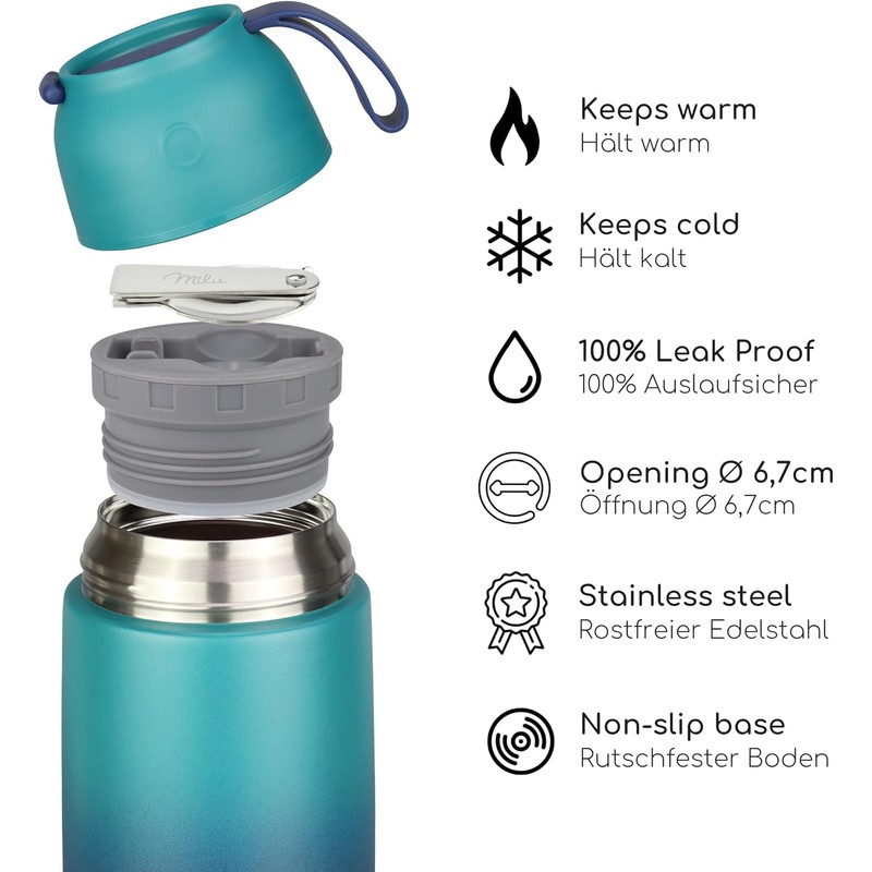 - Top insulation: thanks to the double-walled vacuum insulation, your favourite food stays warm for up to 9 hours or cool for up to 16 hours. Do not use annoying cool bags and save yourself dull ready meals. Enjoy your healthy food anywhere.