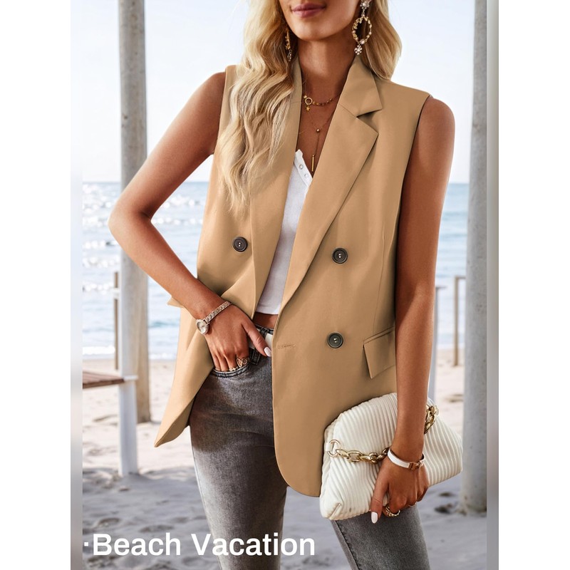 Mina Self 2025 Women's Spring Sleeveless Long Vest Blazer Lightweight Casual Double-Breasted Work Office Jacket With Pockets, Khaki, X-Large