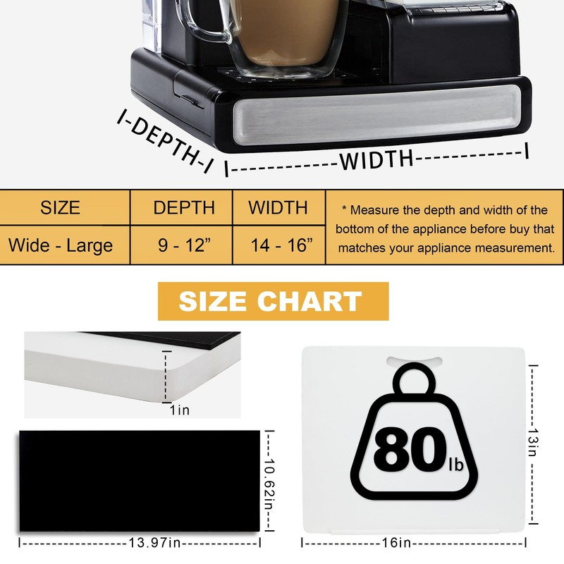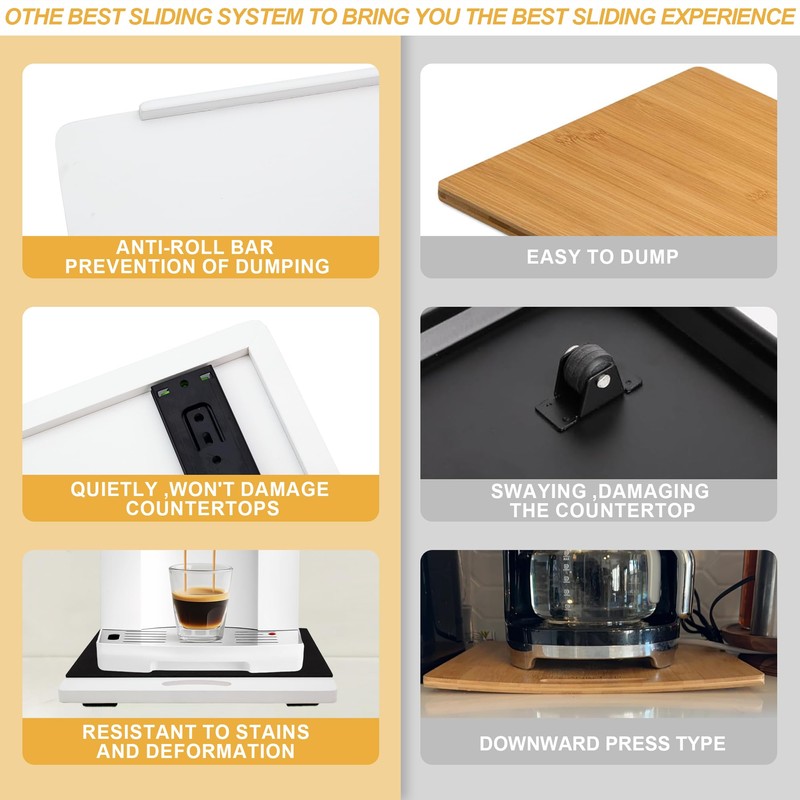 - 【EFFICIENT COUNTERTOP MOTION】 The Appliance Slider features an exceptional sliding system that allows for quick and quiet back-and-forth movement, aiding you in efficiently maneuvering your appliances. Pull out your coffee pot and air fryer from under the cabinet with ease for refilling and use, all the while preventing steam damage to the cabinetry. As an essential kitchen tool, it not only helps declutter your countertop but also effortlessly relocates frequently used appliances.
