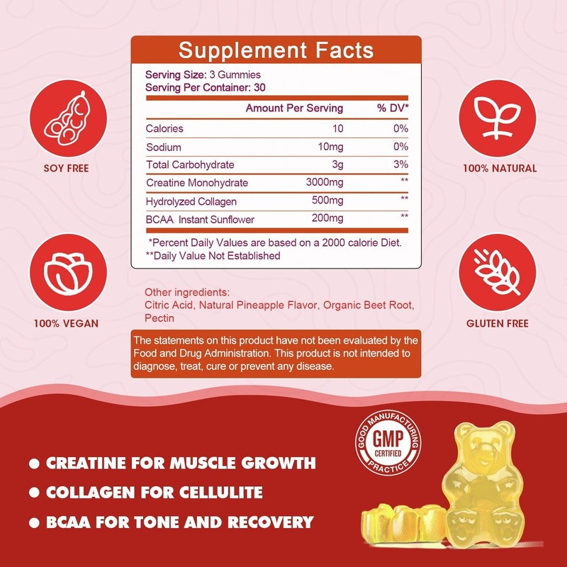 **Clean and Conscious Ingredients:** Formulated with gluten-free ingredients and real fruit flavor, our creatine gummies provide guilt-free supplementation that aligns with your commitment to a healthier lifestyle.