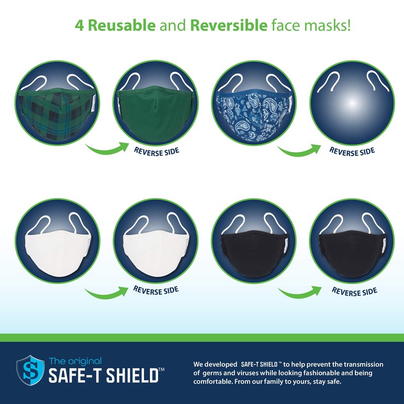 - Contiene 4 máscaras reutilizables y reversibles para adultos.
