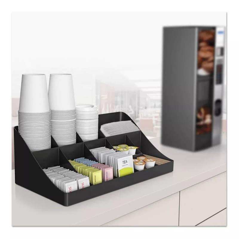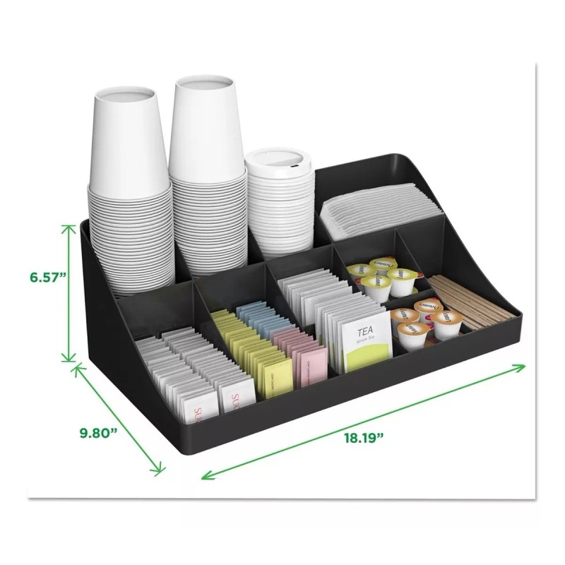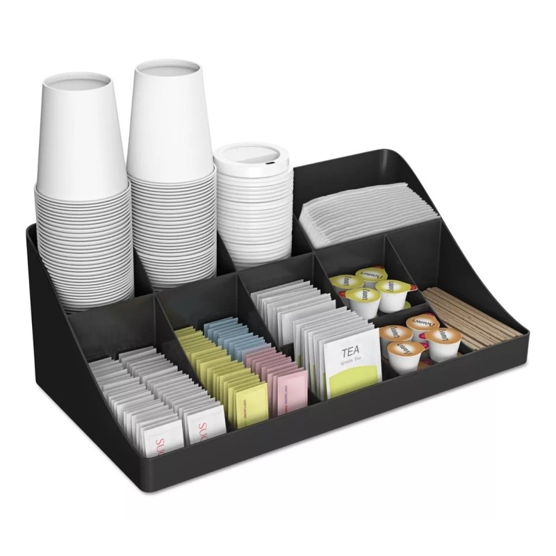 - Mantiene los azúcares, cremas, agitadores, servilletas, bolsas de té, tazas, tapas y más