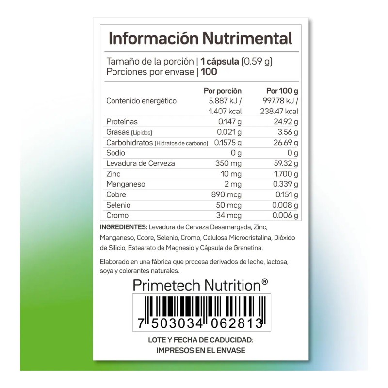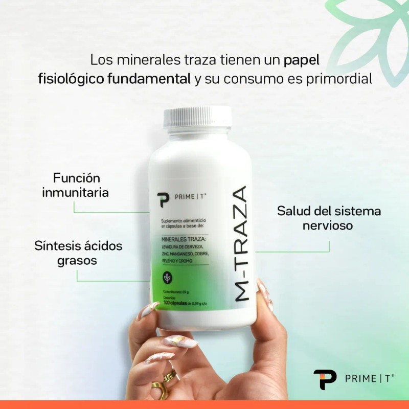 Minerales traza MTraza Primetech 100 Cáps, Cobre, Cromo, Manganeso, Selenio, Zinc y Levadura de Cerveza, elementos esenciales en pequeñas cantidades optimizan importantes funciones fisiológicas