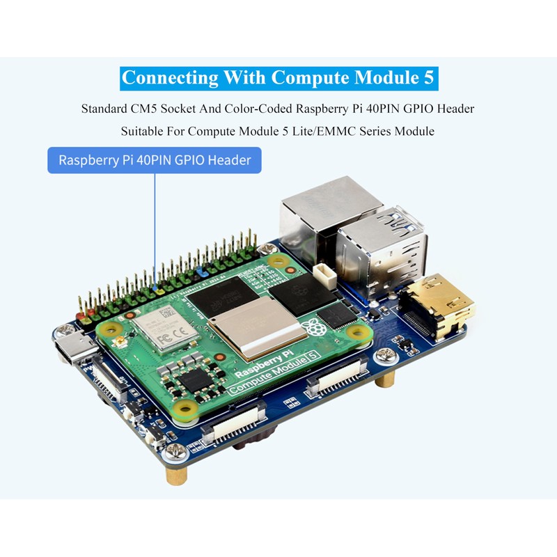 - This is Mini Base Board (A) with standard CM5 socket and color-coded RPi 40PIN GPIO header, compatible with Compute Module 5 Lite/eMMC Series. Suitable for evaluating the Raspberry Pi CM5 or being integrated into end products