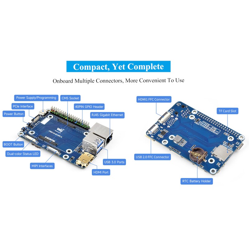1. This is Mini Base Board (A) with standard CM5 socket and color-coded RPi 40PIN GPIO header, compatible with Compute Module 5 Lite/eMMC Series. Suitable for evaluating the Raspberry Pi CM5 or being integrated into end products