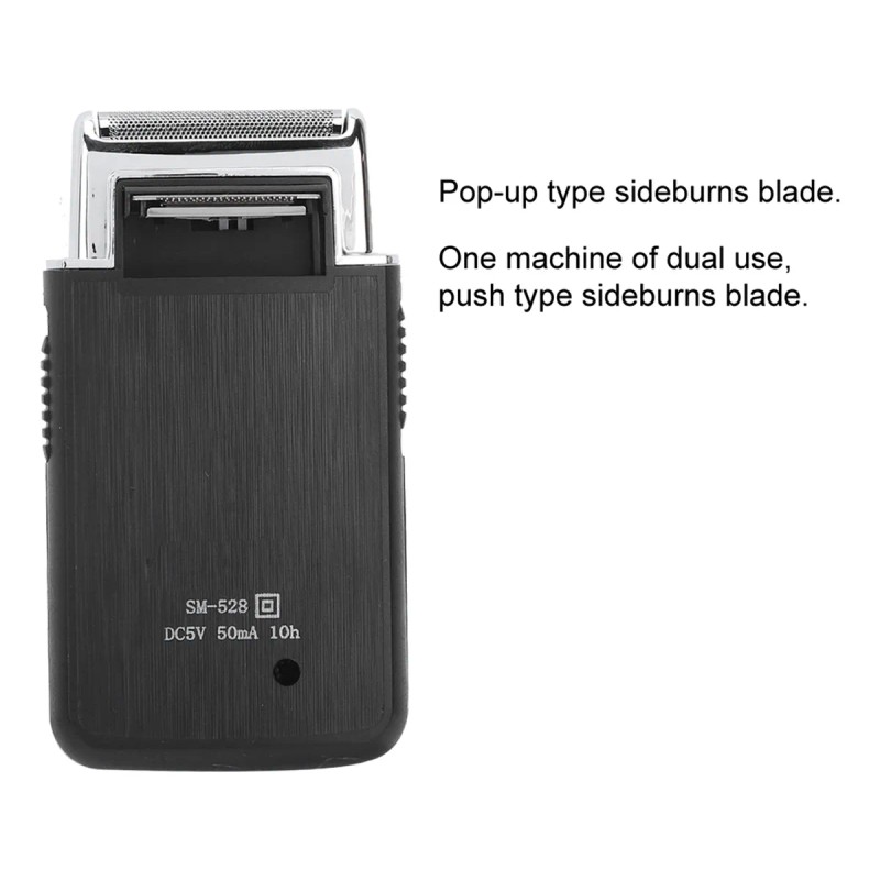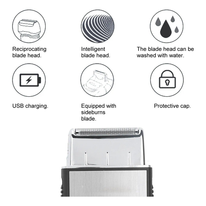motor inteligente de alta velocidad, buen efecto de afeitado de barba. Hoja de acero inoxidable, resistente a la corrosión y duradera, es lo suficientemente incisiva como para afeitarse bien la barba. Material de aleación de aluminio y ABS, cómodo de tocar y sujetar. Diseño de hoja de patillas desplegables, ayuda a cortar y limpiar las patillas. El cabezal de la cuchilla se puede lavar directamente con agua, es fácil de limpiar. Especificaciones: la afeitadora está equipada con hoja de acero inoxidable, resistente a la corrosión y duradera, es lo suficientemente afilada como para afeitarse bien la barba. Material de aleación de aluminio y ABS, cómodo de tocar y sujetar.