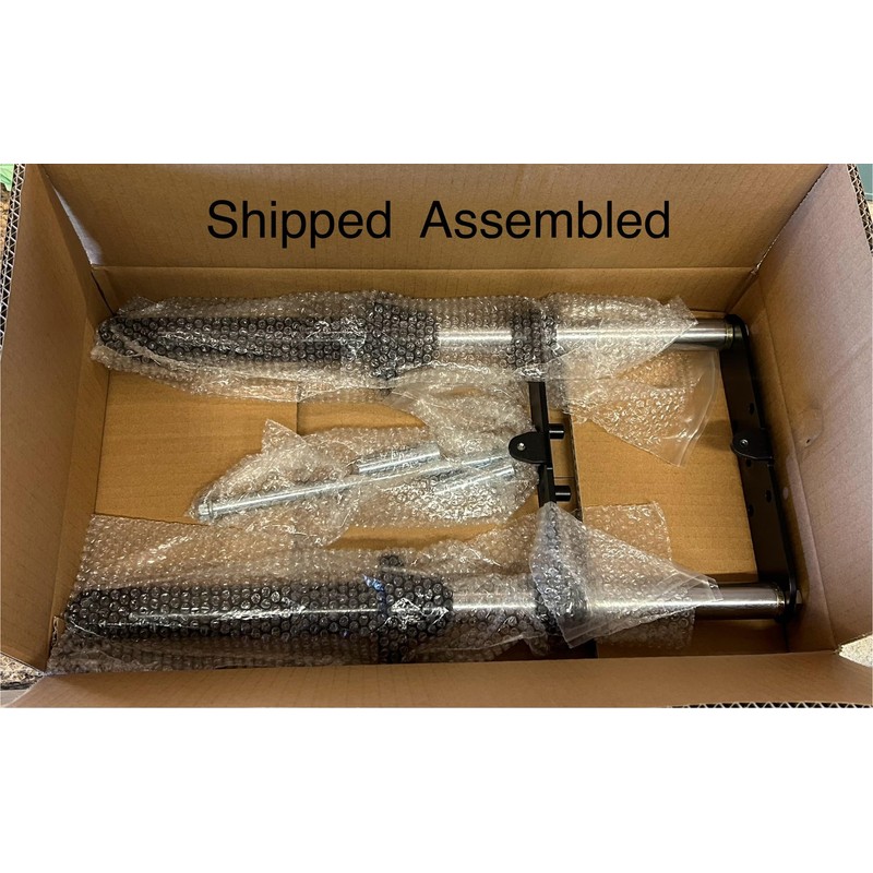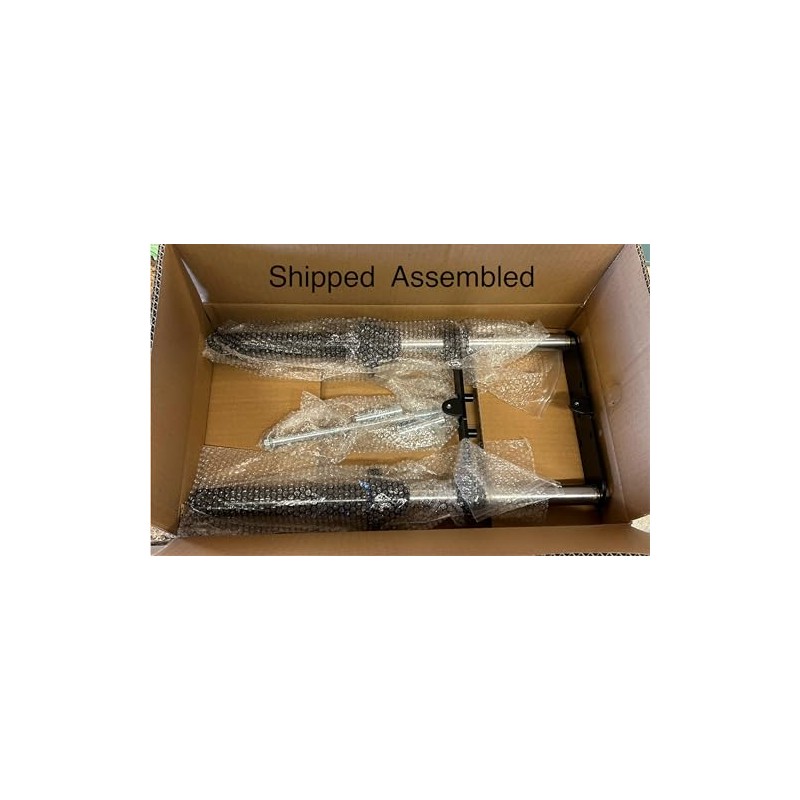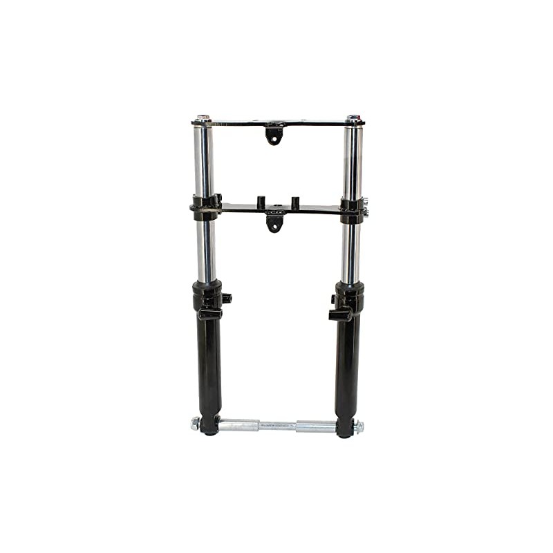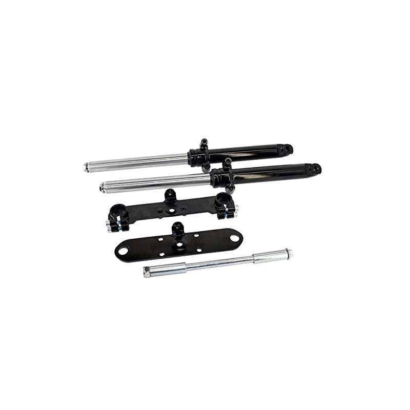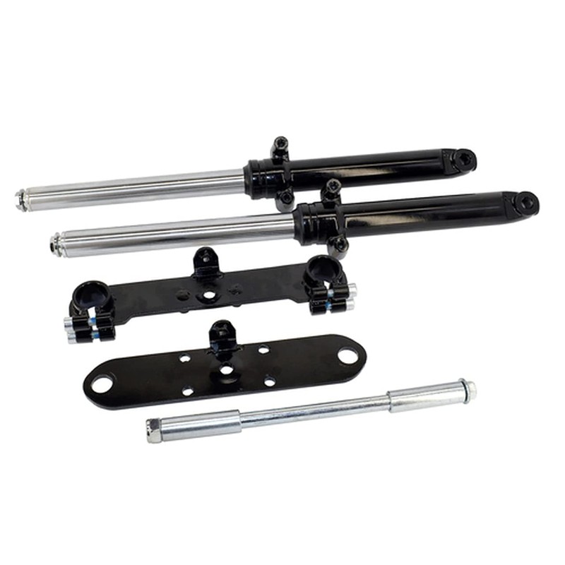 Universal, bolt on, telescopic fork mini bike front end. This is an excellent upgrade to almost any mini bike as it will completely change the way your mini handles and rides. The high quality rubber seals ensure a long life of this telescopic front end. With its fully adjustable lower fork clamp, this front end can be mounted onto virtually any mini bike with a similar length set of forks. If your mini bike has a 5/8" kingpin or axle then simply enlarge the kingpin/axle holes with a 5/8" drill bit. Direct Bolt On Applications Monster/ Mega Moto 80cc / 105cc Motovox 80cc / 105cc All Doodlebugs/Small Bajas (originally equipped with a 4hp or smaller engine) This hydraulic front end can be modified to fit virtually any old school mini bike with similar length forks. Will not fit Coleman Mini bikes. Included with this kit: Two telescoping forks Upper fork plate with bolts Lower fork clamp with pinch bolts 12mm axle bolt 12mm axle nut Axle spacers Dimension: Length (top plate to center of axle) - 19" Inner fork clearance (distance between the two forks) - 6.875" Forks hold 3 oz. of FORK OIL.