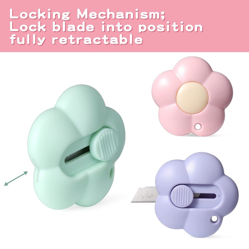 - CUTE MINI UTILITY KNIVES - Pack of 6 flower-shaped mini knives in 3 different colors: Purple, Pink, Green. Which composed of quality ABS shell and alloy steel blade can satisfy your daily need, bringing a lot of convenience.