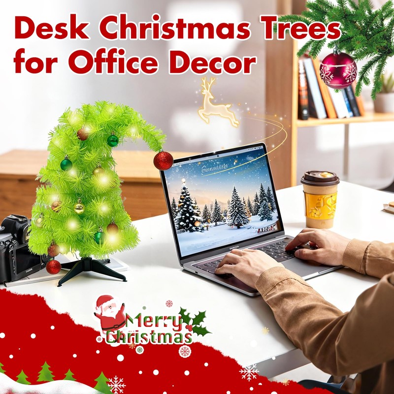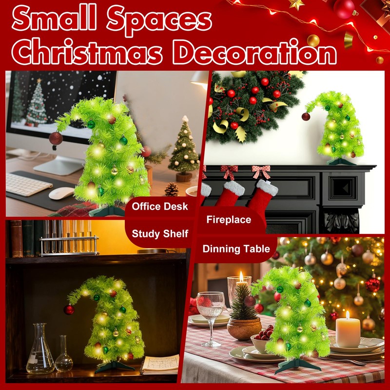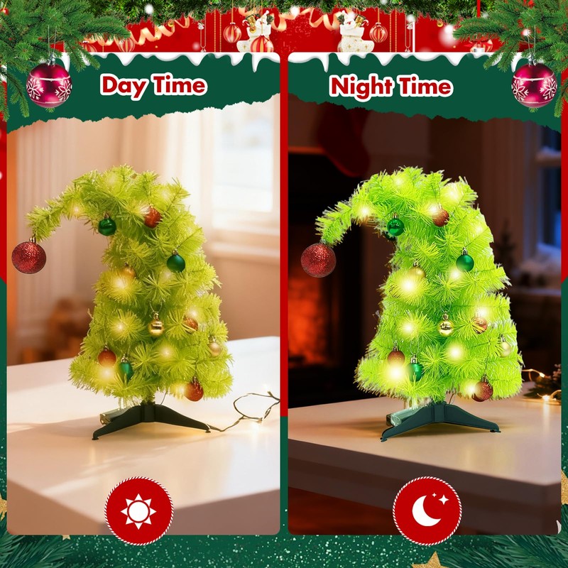- 🎄 Unique 45cm/18in Whimsical Christmas Tree with Warm White LED Lights -- Mrinb ​tabletop Christmas tree​ features a whimsically curved top and a vibrant ​lime green color​, creating a playful holiday centerpiece. The ​pre-strung energy-efficient LED lights emit a soft, cozy glow, instantly transforming your ​desk, office, or bedroom​ into a festive winter wonderland. No tangled wires or extra assembly required!