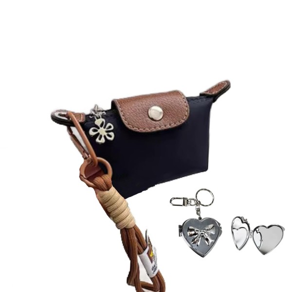 Mini Coin Purse Bag Keychain Set with Heart Locket Charm, Storage Bag, Zipper and Button Closure - Navy
