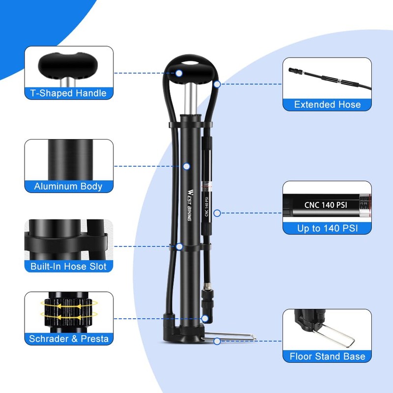 The integrated pressure gauge allows accurate pressure display, while the adjustable hose, T-shaped handle and floor support guarantee comfortable and stable inflation.