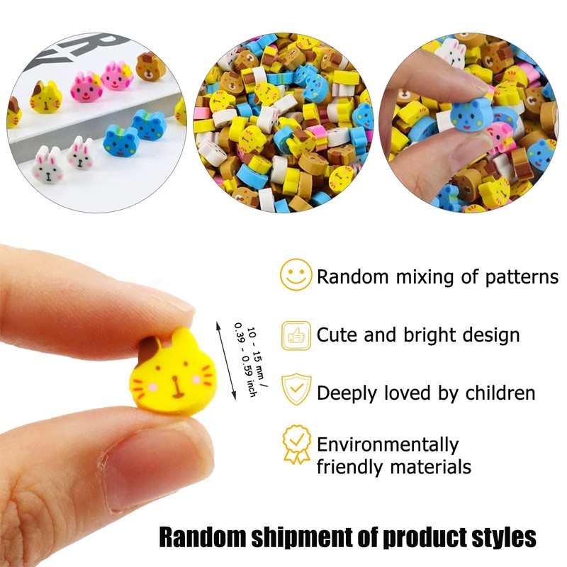 - Mini cute: the eraser set contains a mix of 300 different patterns, including animals, fruits, hearts, etc. Each pattern has bright colours and vibrant designs loved by children. These erasers are usually small, easy to carry and suitable for small children's hands.