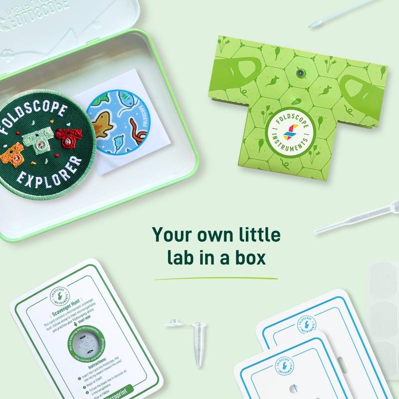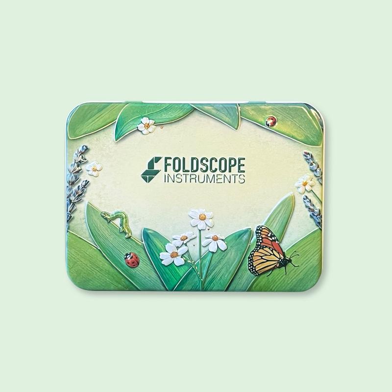 The Mini Explorer Kit provides one assembled Foldscope Mini microscope, a selection of accessories, and a beautiful metal storage box. This kit is perfect for on-the-go exploration & anyone seeking a quick and convenient dive into the microscopic world.