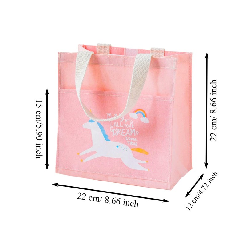 2.Tote bag measures 22cm long, 12cm wide and 22cm high. In general, small and exquisite, very suitable for carrying vegetables, fruits, snacks and books, etc. to school, office, travel, vacation, camping and other places.