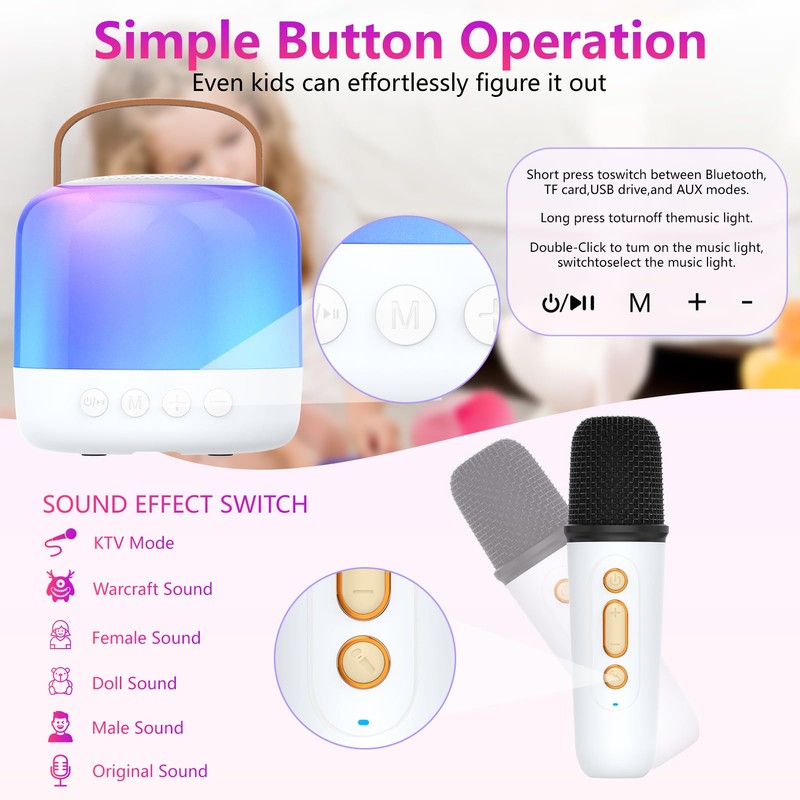 Mini Karaoke Machine with 2pcs Wireless Microphones,Portable Bluetooth Speaker for Kids and Adults with LED Ambience Light,Gifts for Girls and Boys 4 5 6 7 8 9 10 12 Year Old Birthday Party Home