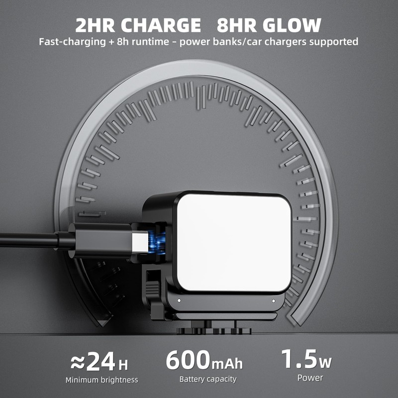 - Long-Lasting Battery for Extended Creativity - Equipped with a 600mAh high-capacity battery, this vlogging light delivers up to 1.5 hours at max brightness and 24 hours at minimum brightness. The included charging cable fully powers it in just 1.15 hours, ensuring quick turnaround for spontaneous shoots.
