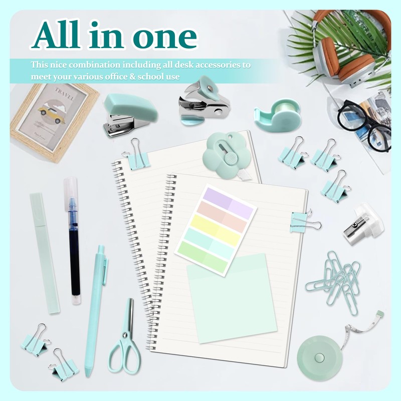 - 【Teal Mini Stapler Set】You will receive a complete teal mini office supply kit, including 1x mini stapler, 1x mini tape dispenser, 1x pencil sharpener, 1x mini scissor, 1x mini staple remover, 500 pieces of staples, 2x clear tapes, 20 pieces of paper clips, 12 pieces of binder clips, 1x tape measure, 2x gel pens, 1x highlighters, 1x teal transparent sticky notes, 5 colors index tabs, 1x mini box cutter; This nice combination has all the desk accessories that can meet your various office and school study needs and save your matching time