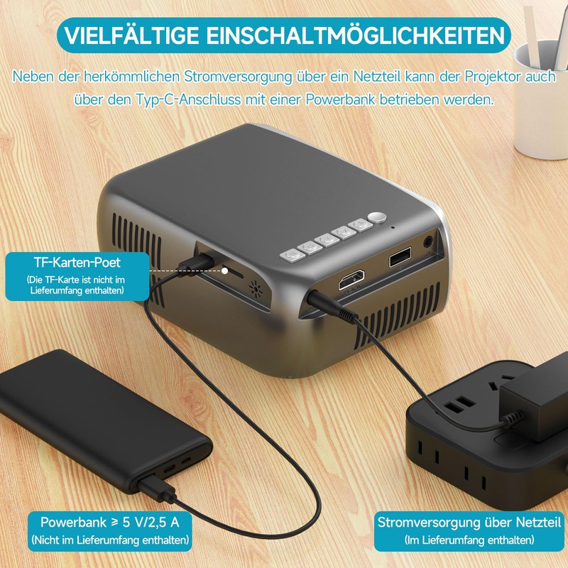- 【Type-C Input】Our mini projector supports Type-C input, which means you can use most input cables from your smartphone or power bank to charge the projector, no need to worry about how to charge if the AC cable is lost.