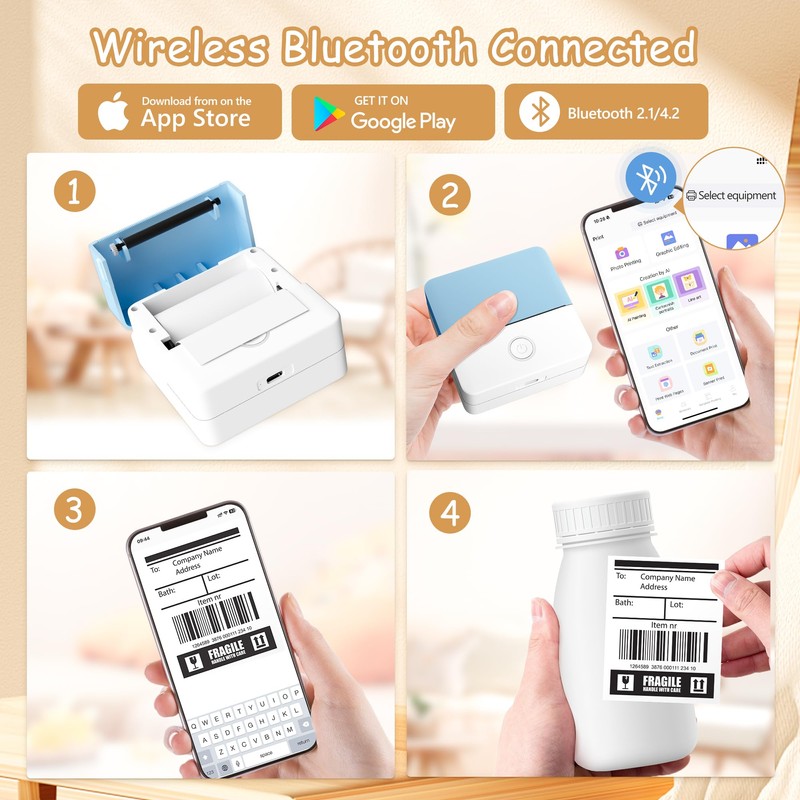 - Fast & Simple Bluetooth Connection: This mini sticker printer features Bluetooth 2.1/4.2 for instant wireless printing. No ink or toner needed—just seamless, cost-effective printing. Simply turn on Bluetooth, open the Tiny Print app, and connect in seconds! Compatible with iOS and Android, this print pods mini printer ensures hassle-free printing anytime, anywhere. Download "Tiny Print" from the App Store or Google Play, and start printing effortlessly.