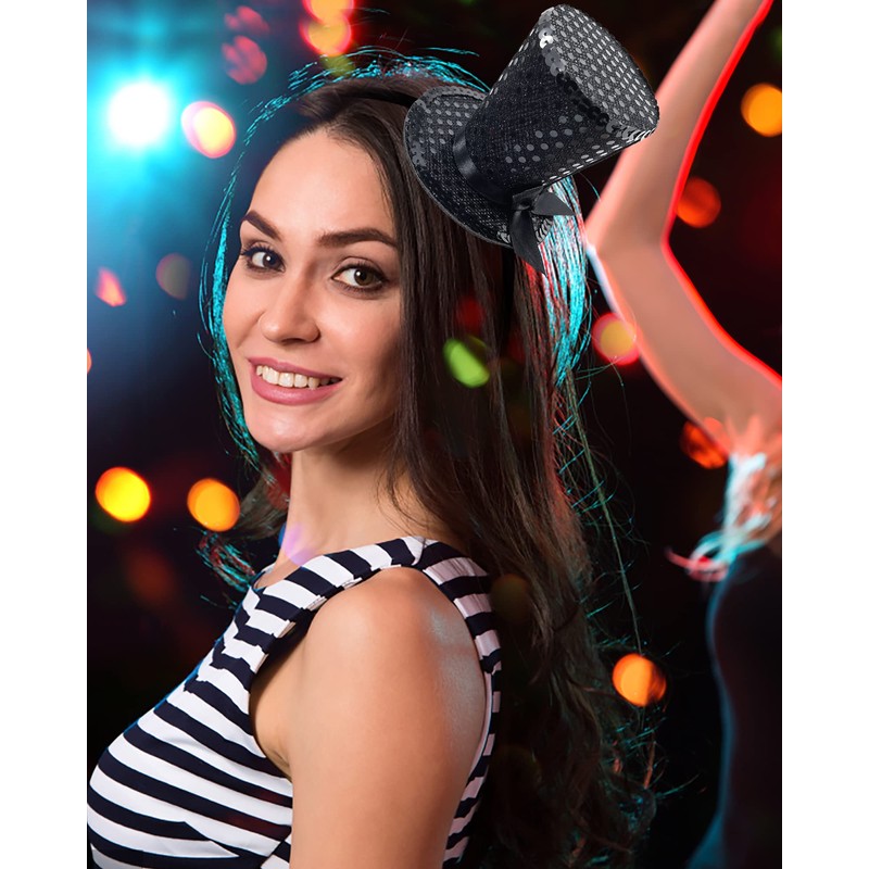 - 【Sturdy & Comfortable】The sequin mini top hat headband is made out of premium polyester.This party top hat with black band is affordable without sacrificing quality or your comfort. Keep your hair accessory in place with the hidden hair clips and curved brim. Add a mysterious vibe to any costume with the sparkling glitter finish, satin ribbon trim and tulle veil. Add it to your derby Outfit, Victorian Dress,1920s Burlesque costume,Wedding Outfit,and more