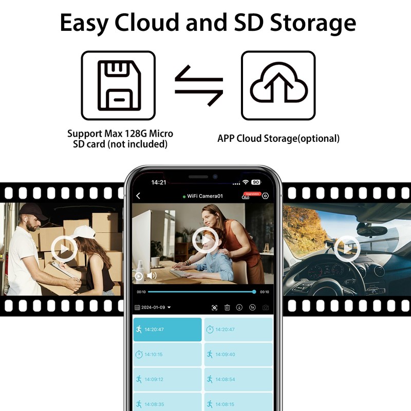 • 【Motion Detection & Alarm Notification】 Equipped with intelligent motion detection technology, when the camera detects movement, it will immediately send real-time notifications to your smartphone, so that you can always know the security status of your home no matter where you are. The application can easily distinguish between motion detection Record and regular Record, and schedule them at a scheduled time, allowing you to efficiently monitor a specific time period, reduce unnecessary video Record, and view necessary footage immediately.
