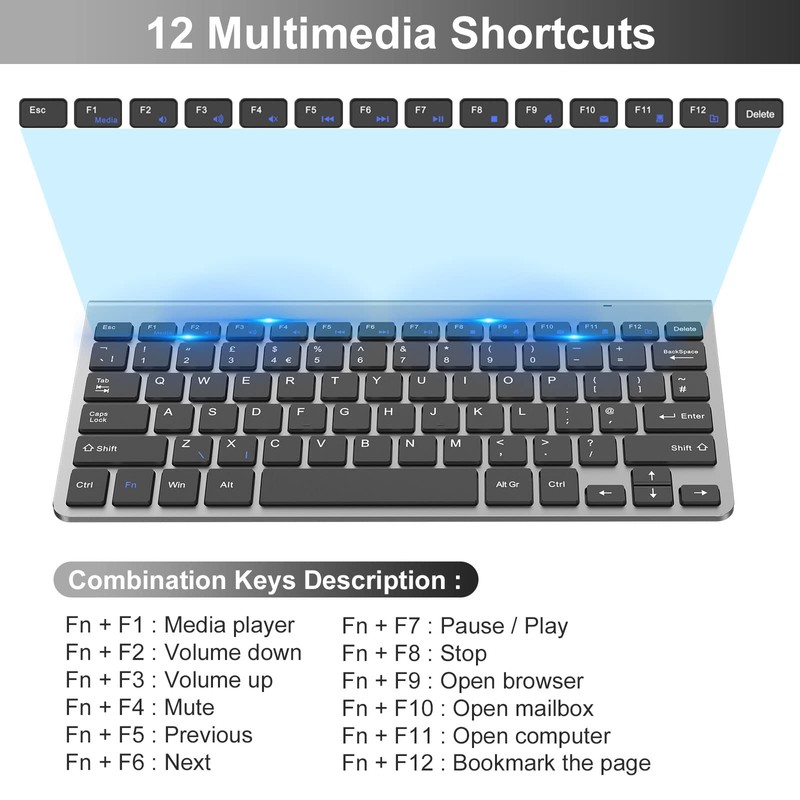 12 Multimedia Keys: 12 Multimedia hot keys on the mini keyboard help you to play music, browse the web, open email and more, extremely convenient and high efficiency