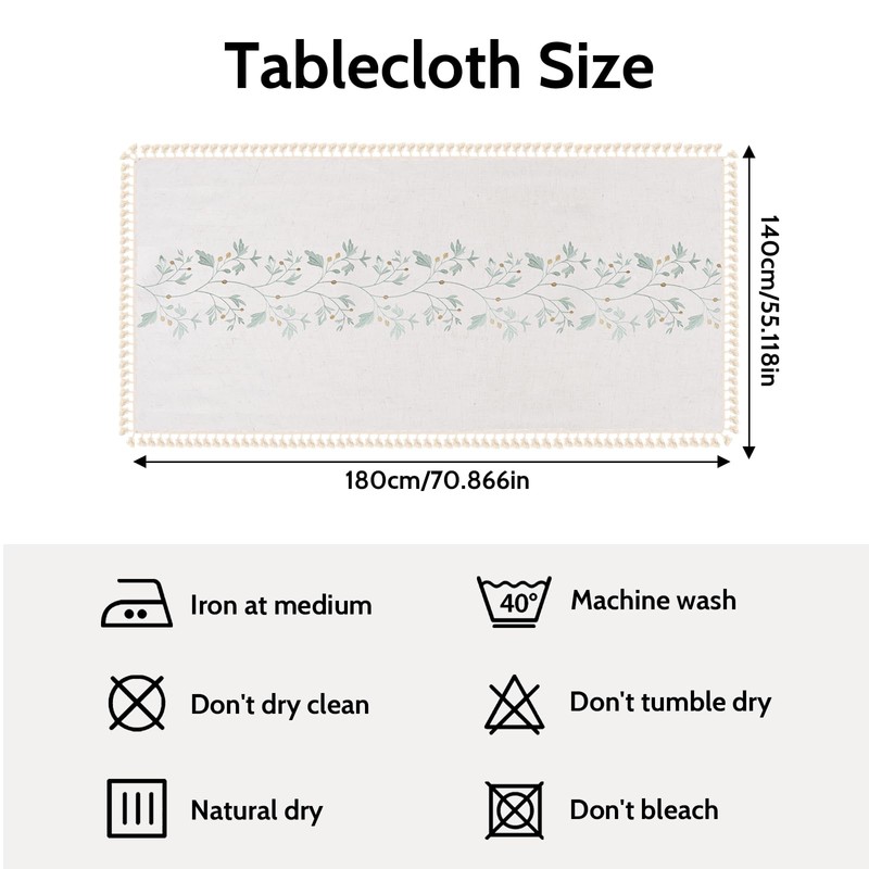SIZE:Tablecloth measures 140*180 cm/55 "x70.8" including fringe length. Suitable for tables with 4-6 seats.