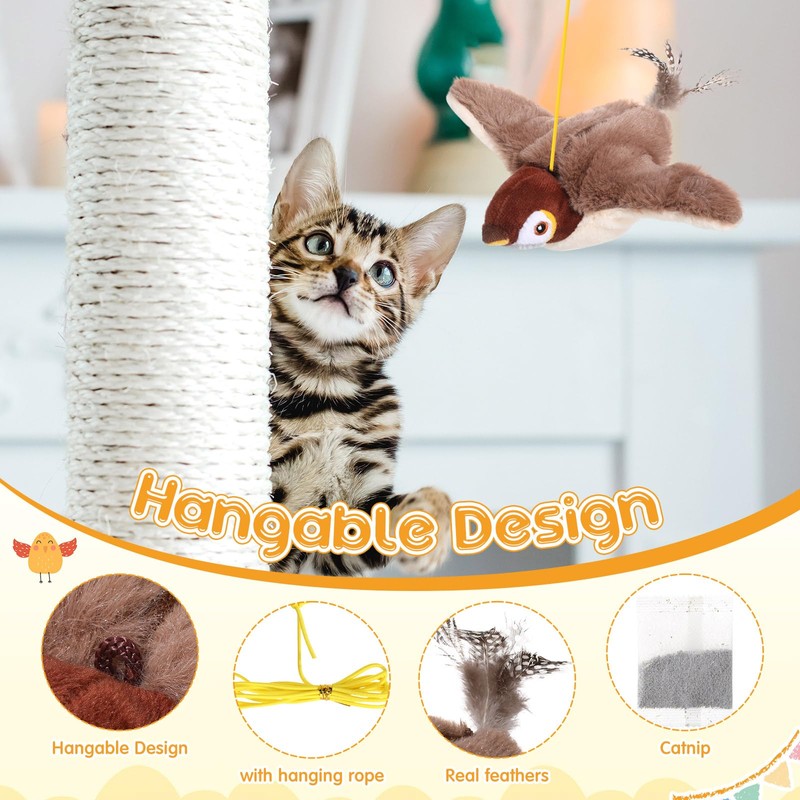 - Packing List: the flying birds cat toy package contains 2 pcs feathered birds of prey with catnip, 1 pcs simulated big sparrow and 1 pcs Long-tailed Chickadee with a Type C charging cable and lanyard