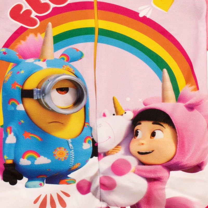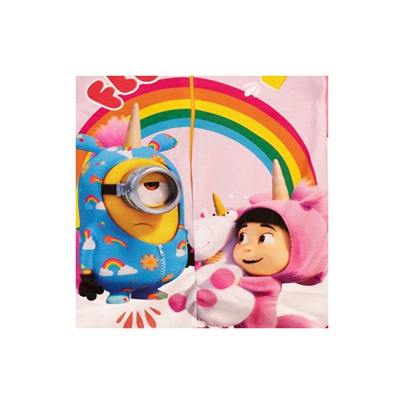 Featuring a captivating print, this onesie showcases Agnes from the Despicable Me series, dressed in an irresistibly cute unicorn suit, alongside the lovable Stuart the Minion, who's sporting a unicorn suit but looking somewhat less than thrilled – a playful and heartwarming design that kids will adore.