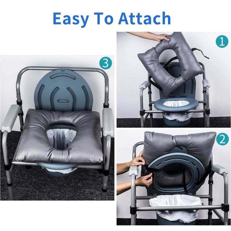 UNIVERSAL FIT & EASY TO ATTACH. - Cushioned commode seat fits most standard size toilet and commode seats. Toilet seat cushion measures 17 x 17 inches. As this bedside commode cushion featuring 2 pcs adjustable velcro straps, so it is easy to fix to different styles of toilet seats and toilet bowls, which help to stay securely in place and will not slid around.