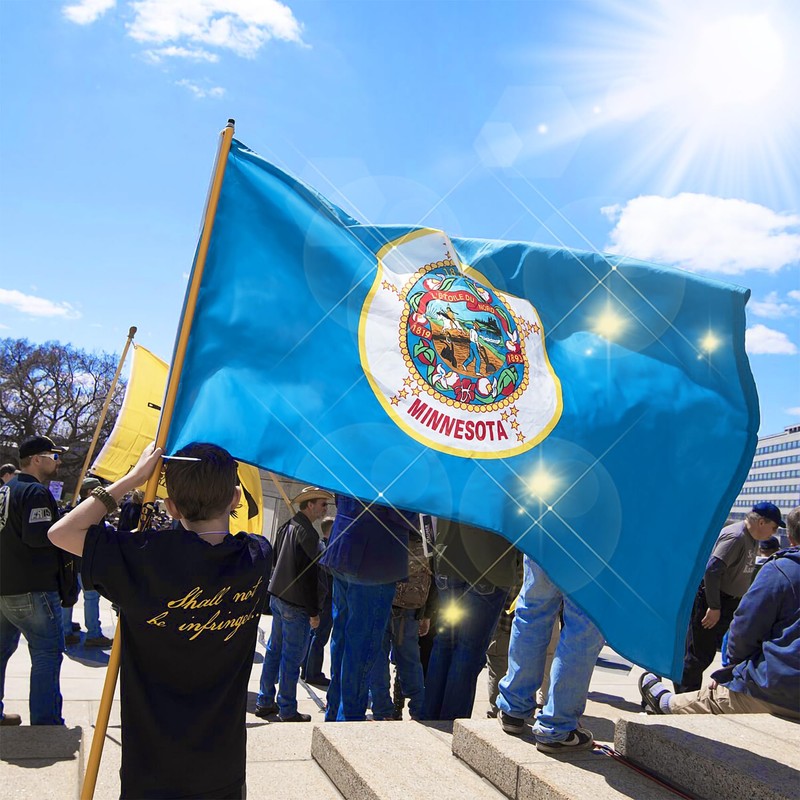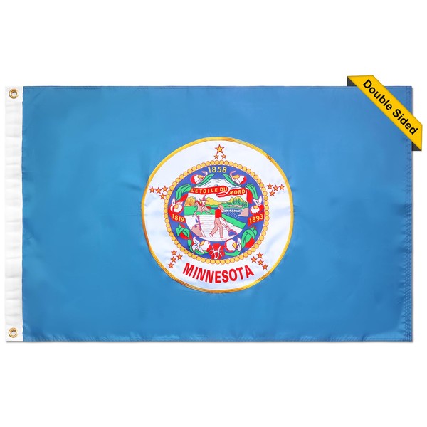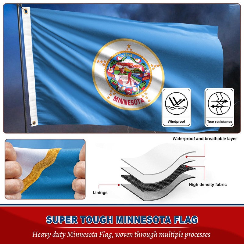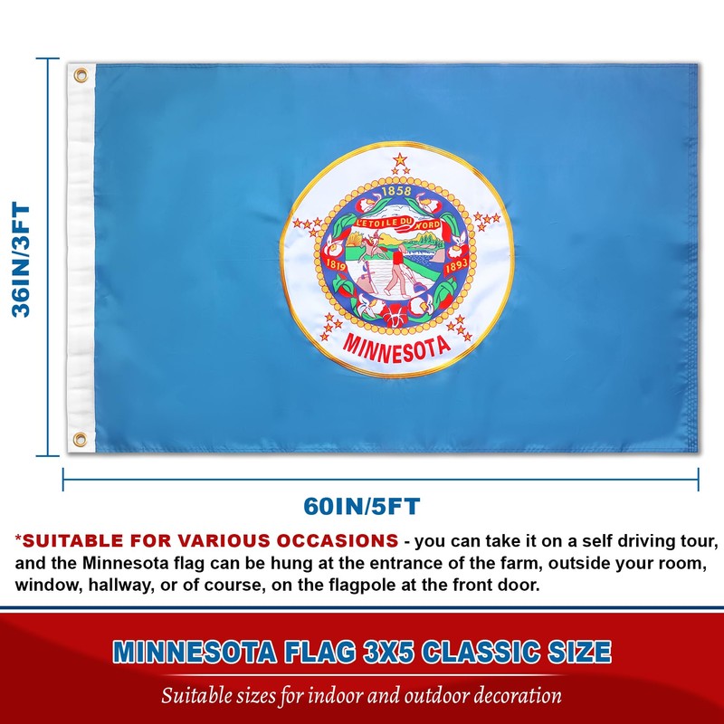 Heavy Duty Minnesota State Flag for Outdoor Conditions: This heavy duty Minnesota flag is constructed for durability, making it ideal for all-weather outdoor display. With premium materials and weather resistance, this Minnesota state flag 3x5 outdoor nylon maintains vibrant colors and structural integrity over time, ensuring a reliable, long-lasting flag for any setting Minnesota Flag Double Sided with Embroidered Emblem for Refined Detail: This Minnesota state flag embroidered features intricate stitching, showcasing the emblem in vivid detail. The embroidered Minnesota state flag 3x5 outdoor adds a touch of sophistication and durability to the design, ensuring a high-quality appearance that endures through long-term outdoor display. Built for both formal and casual settings, this Minnesota state flag American made captures the pride and heritage of Minnesota with lasting craftsmanship and attention to detail Minnesota Flag with Brass Grommets: Built with sturdy brass grommets, this double sided Minnesota state flag 3x5 ft is easy to mount securely on any flagpole, remaining stable even in strong winds. This double-sided design ensures visibility from both sides, providing a clear and vibrant display wherever it's placed Versatile Minnesota State Flag for Varied Locations: Perfect for a variety of settings, this Minnesota flags for outside is suitable for homes, offices, schools, and community spaces. Whether displayed at local events,parties or state celebrations, this Minnesota state flag embroidered brings a meaningful and strong visual impact to any environment Premium Minnesota Flag for Lasting Display: Made from resilient nylon, this Minnesota state flag 3x5 is crafted to resist fading, tearing, and fraying. With its durable construction, this Minnesota state flag provides a high-quality symbol of pride, ready to showcase Minnesota heritage for years