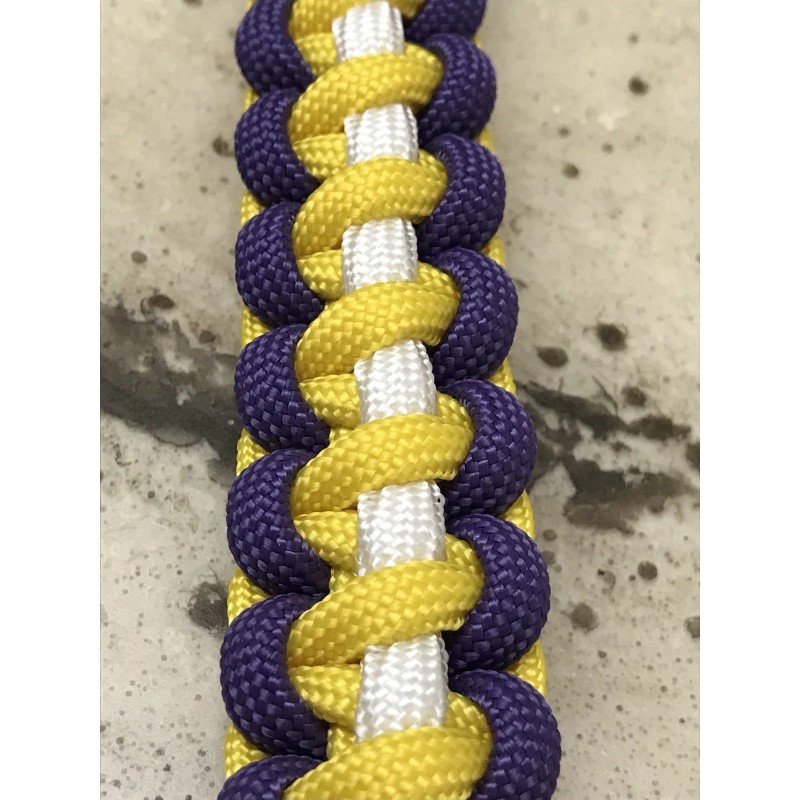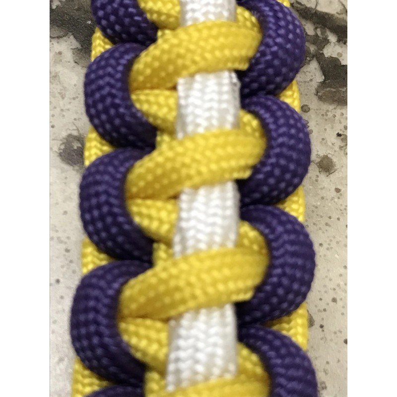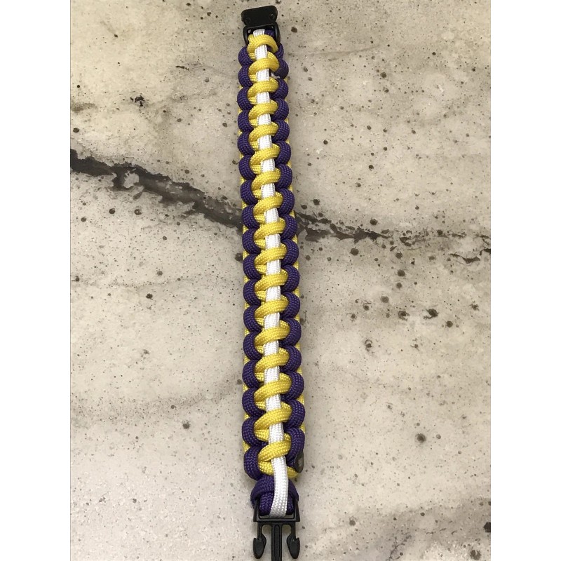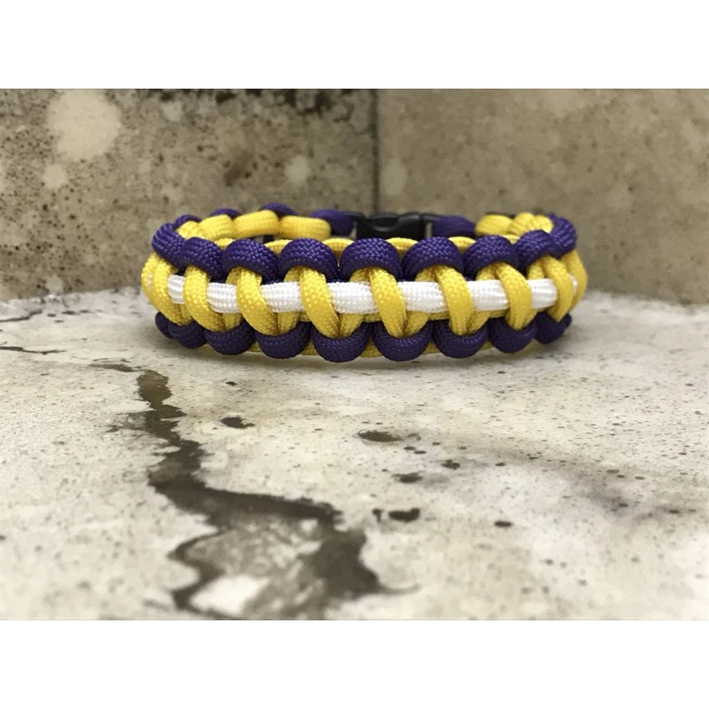 My Paracord Bracelets unravels to approximately 9 feet of 550lb Paracord. 5 feet of Purple, 4 feet of Yellow and 1 foot of White. The buckle I use for all the bracelets are black. If you like a different color buckle please let me know. Color buckles are an additional $1. These are GREAT for Sports Teams, School colors, and or just because!!!!