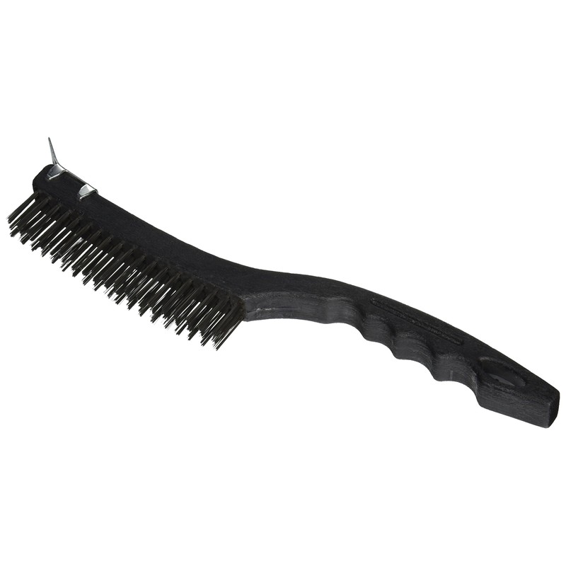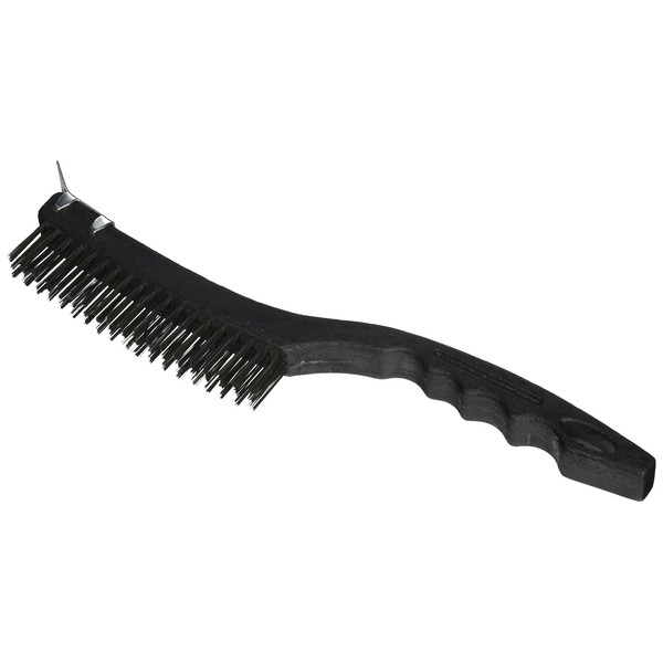 Prosource wire brush, steel trim, 19 rows, long handle, plastic handle, black. Mint craft SJ3133-S plastic long handle wire brush with scraper has a plastic handle a steel wire brush. Great for use with painting. Scrapes paint and debris to prepare surface for working.