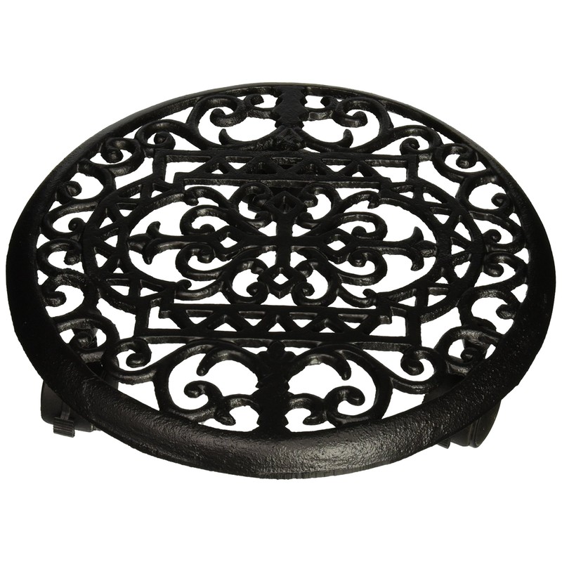Mintcraft 12" Plant Stand Dolly. The dolly is made of cast iron with a black powder-coated finish. The stand has three casters and has a 100 pound weight capacity. Measures 2-7/8" height x 12-7/8" diameter.