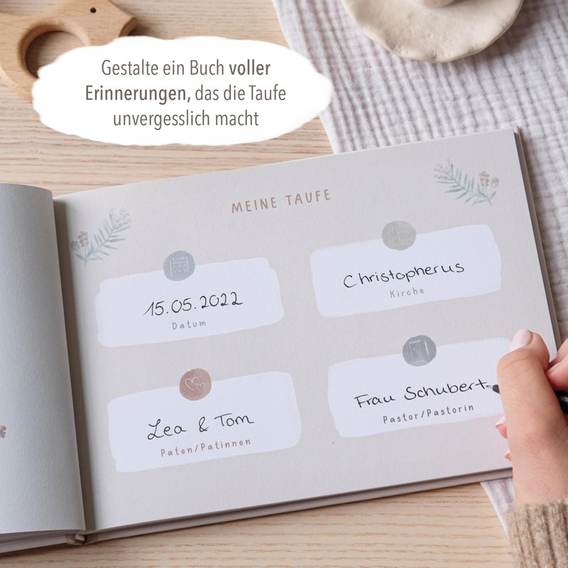 - Stylish and high quality – so that this christening book accompanies your baby for a lifetime, the album is particularly high-quality workmanship - with sturdy thread binding and hard cover (14.8 cm x 21 cm)