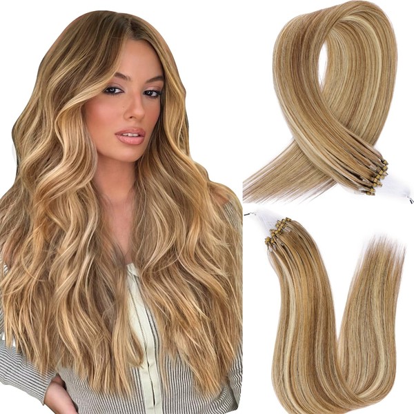 MioYio Microlink Hair Extensions Human Hair #607 Light Medium Brown with Blonde Balayage 30g/38s/Pack 16inch Microbead Micro Loop Hair Extensions Real Human Hair