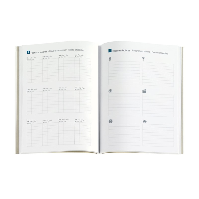 - It contains: annuity day by page (Saturday and Sunday in full page), calendars 3 years, bimonthly calendar on each double page, recommendations, dates to remember, monthly planning.