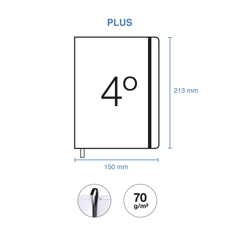 - Rigid cover made of cardboard lined and matt plasticized with elastic closure rubber and pen holder. Stitched binding with marker tape and inner pocket.