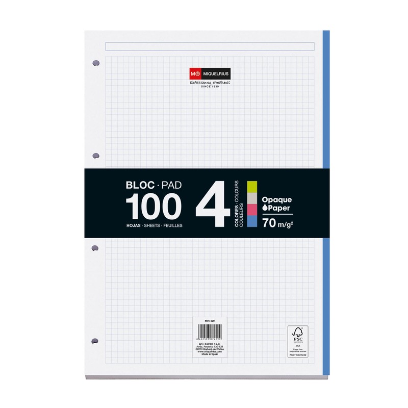• Folder with 4 rings with 35 mm diameter. Includes 100 sheets of A4 refill (25 sheets per color) with 5x5mm grid, title heading and 4 colored strips for easy organization and separation by topic.