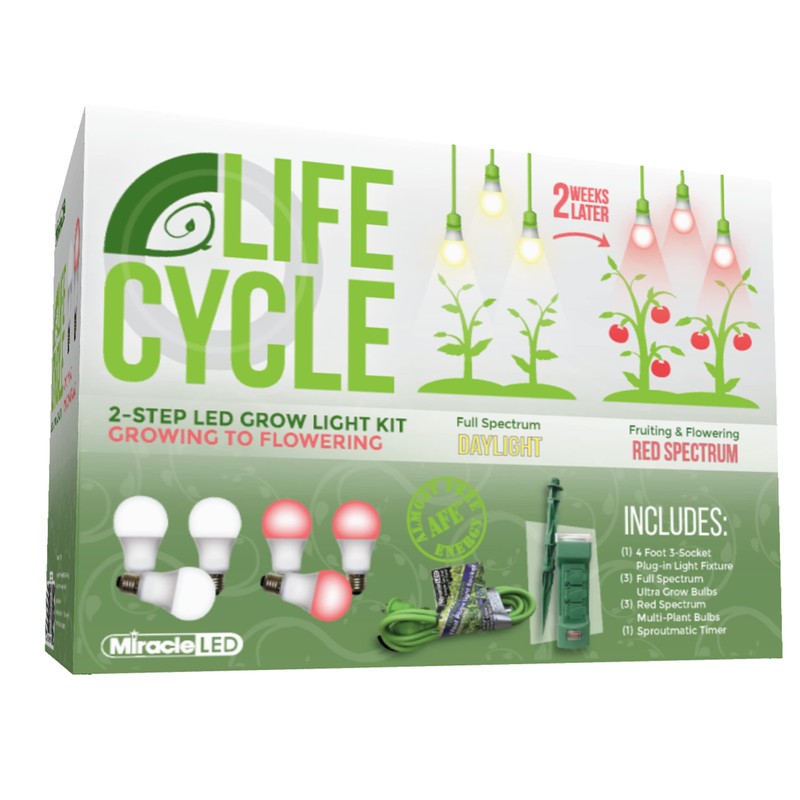 Miracle LED Plant Life Cycle 3-Socket Synchronized Grow Light Kit with 3 Full Spectrum Ultra Grow Bulbs and 3 Red Spectrum Multi-Plant Bulbs with Sproutmatic All-Weather Timer Controls