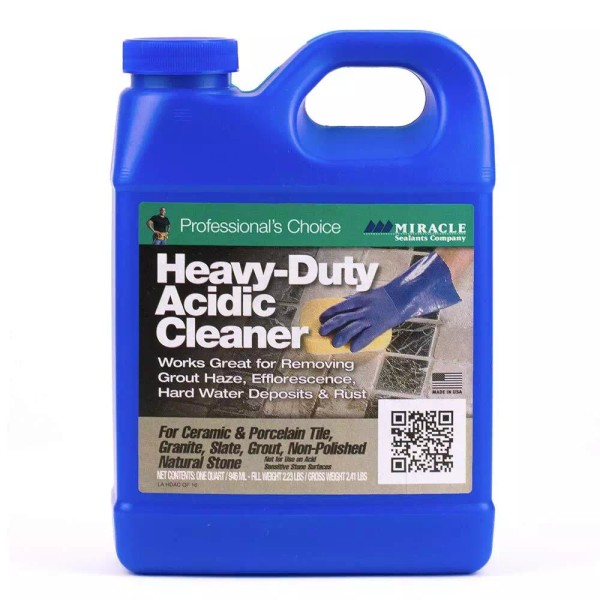 Miracle Sealants Heavy Duty Acidic Cleaner is a fast acting, heavy duty acid cleaner for use on interior and exterior textured, non-polished, natural and manufactured surfaces. Cleans and removes cementitious grout and mortar residue, joint cement, lime and hard water deposits, efflorescence, rust and other heavy dirt and grime.