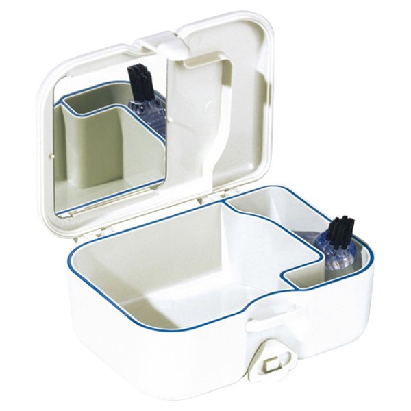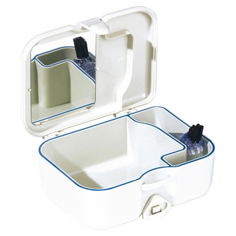 In the chest compartment there is a small, ergonomically shaped prosthesis brush. With the white larger bristle field, the outside of the prosthesis can be cleaned well, with the black small bristles the inside. Cleaning tablets also find their place in this compartment. A mirror attached to the lid makes it easier to insert the prosthesis.