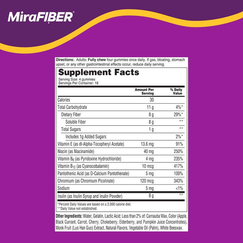 - 8G OF DAILY FIBER: Only 7% of Americans get the recommended daily amount of fiber every day. MiraFIBER Gummies offers the most fiber per serving. With just 4 gummies every day, MiraFIBER Gummies supplements more than 25% of your daily fiber intake
