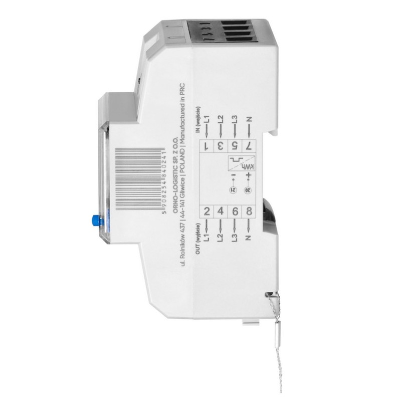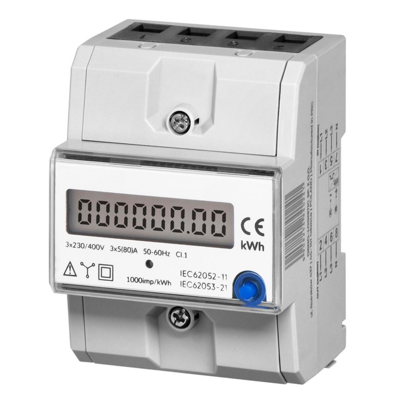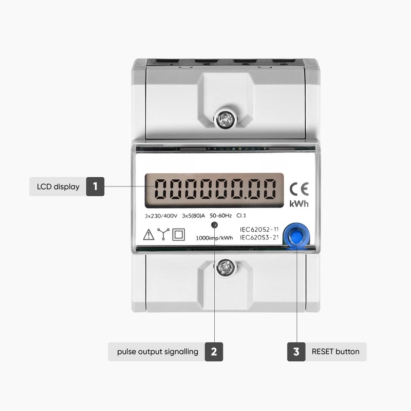 The 3-phase power indicator with a maximum current of 80A is a device that allows accurate monitoring of power consumption in three-phase systems. It is equipped with an additional counter to control periodic energy consumption and a pulse output that allows monitoring of the indicator by additional external devices, such as measuring the energy consumption of a washing machine/washing cycle or measuring the energy consumption when charging an electric car.