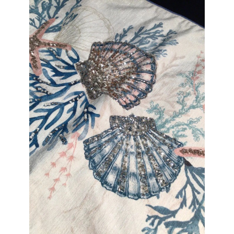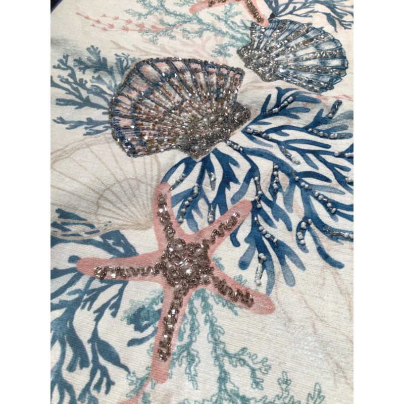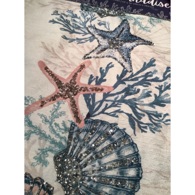 NEW with Tag: MIREILLE Coastal collection Hand glass beaded accents on fabric printed sea shells with sea corals, shell pattern Table runner centerpiece. Size 14 x 72 inches.