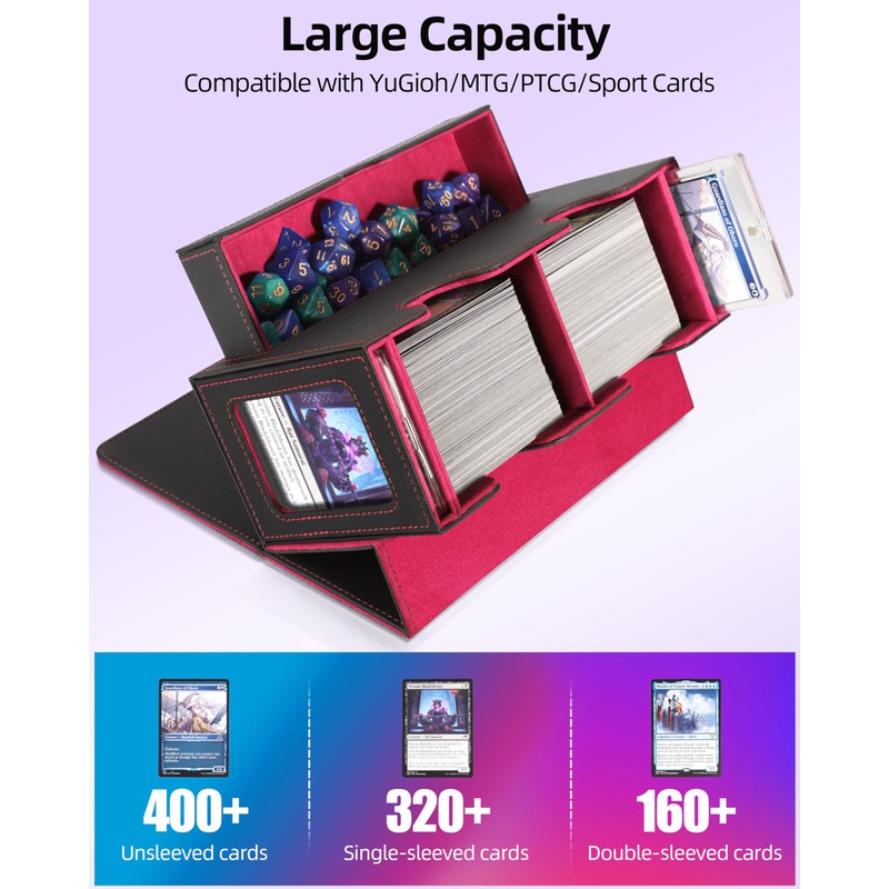 • 【Unique Design】-U-shaped openings and magnetic flip-cover make it easy to access and return cards in game. In addition, the storage case cover can be turned into a handy stand or even a play mat. There is also a built-in dice tray to ensure that all your gaming essentials are neatly organized and within reach.