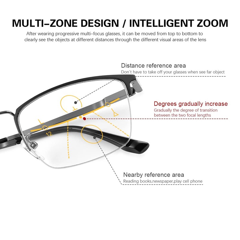 - Lentes de lectura multifocal: lente multifocal progresiva inteligente que proporciona la mejor experiencia. Los lentes de lectura multienfoque cuentan con tres puntos fuertes en un par de lentes de lectura para que puedas leer, trabajar en tu computadora e interactuar con otros sin tener que quitarte las anteojos. Como se trata de un par de anteojos multifocales progresivas, por lo que en general, necesitas aproximadamente una semana de adaptación. Pero el período de adaptación varía de persona a persona, camina más lento cuando se siente mareado.