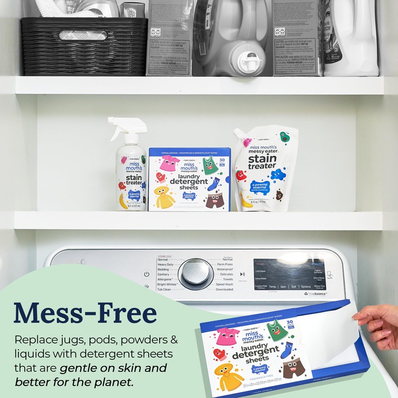 - THE PERFECT PAIR - To tackle stains, pretreat with Miss Mouth's Messy Eater Stain Treater before using our Laundry Detergent Sheets. Together, they deliver a powerful, stain-fighting clean that leaves clothes fresh and spotless, even on the messiest of laundry days