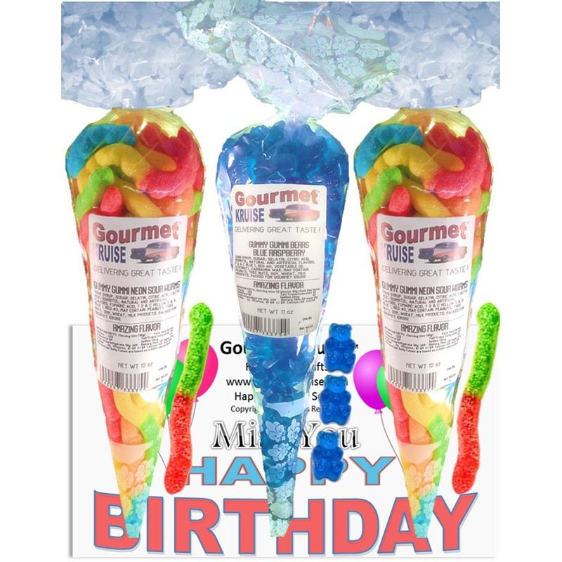 Miss You Happy Birthday Series Bright Sour Worms And Blue Raspberry Gummi Gummy Bears (NET WT 31 OZ) (Pack of 3) In 1 Box Gourmet Kruise Signature Gift Bags