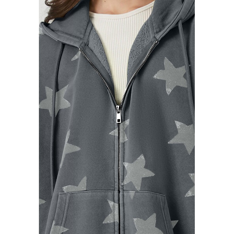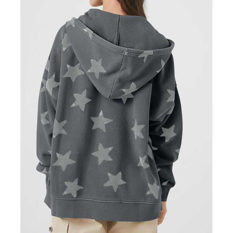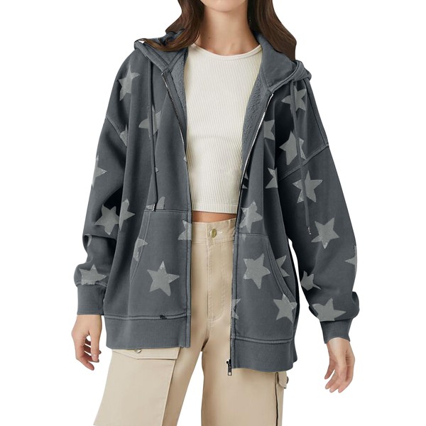 MISSACTIVER Women Star Graphic Zip Up Hoodies Y2k Drawstring Star Print Sweatshirt Oversized Jackets with Slant Front Pocket Grey